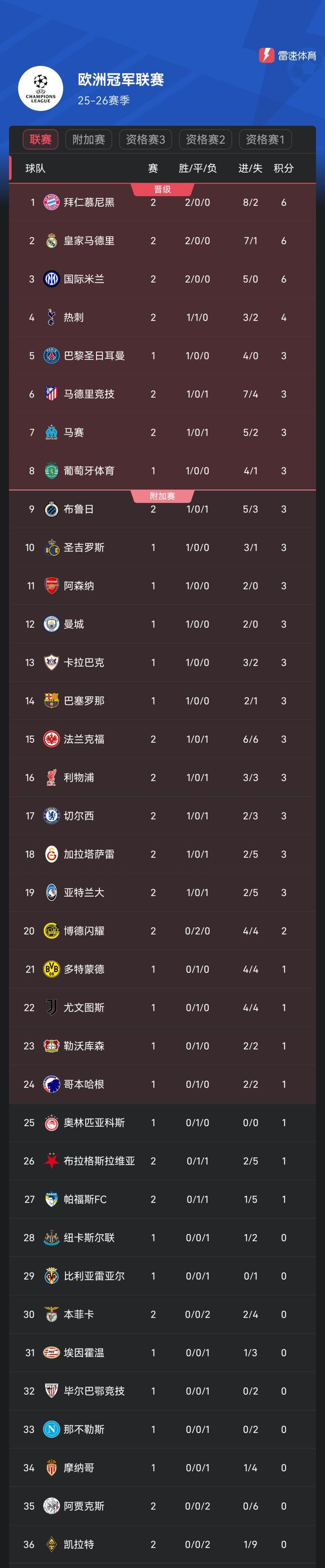 在最新积分榜上,拜仁、皇马、国米均获6分,拜仁凭借净胜球优势暂时领跑。