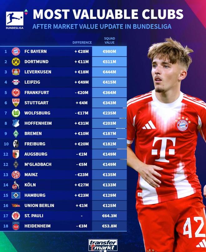 北京时间12月19日,在更新了德甲球员的身价之后,德转列出了此次更新后德甲俱乐部的球员总身价排名,拜仁慕尼黑以9.8亿欧元排名第一,多特蒙德5.11亿欧元第二,勒沃库森4.44亿欧元第三,海登海姆5380万欧元最低。